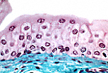 | 泌尿系统的假复层被覆上皮中,基底层细胞、球拍状细胞和盖细胞(穹顶细胞)共同构成尿路上皮(尿路型移行上皮),是识别该上皮的特征。 | |
