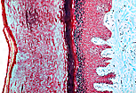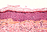 表层出现由无核扁平角化细胞构成的角质层,是识别复层扁平角化上皮的特征。当表层细胞快速脱落导致角质层较薄时,该上皮为B型复层扁平角化上皮。