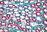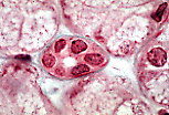 在光镜下,细胞核两侧的细胞质几乎难以观察到。 (肾小管横切面) |