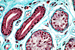 在汗腺导管的横切面上,贴近管腔的细胞其细胞核占据细胞的整个高度。 |