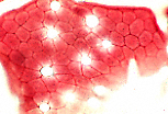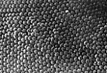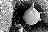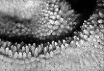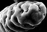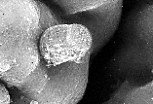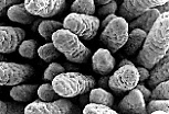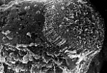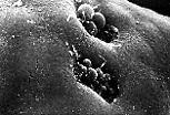 继续提高扫描电镜放大倍数,可观察到覆盖吸收细胞表面的每个微绒毛末端。杯状细胞正在分泌黏液滴。 |