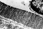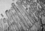 质膜呈三层结构,表面覆盖糖萼。肌动蛋白微丝在微绒毛中央呈横断状态。 |