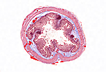肠绒毛横切面呈圆形,包含中央结缔组织轴心,表面覆盖由吸收细胞和杯状细胞构成的单层柱状被覆上皮。基膜将上皮与下方的结缔组织分隔开。 |
