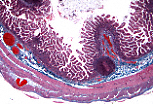 从图像中央的肠腔开始,回肠壁可识别出以下区域:黏膜皱襞区、结缔组织区(黏膜下层)、平滑肌组织区(肌层)。 |