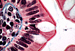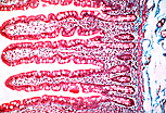 肠上皮中的 杯状细胞 具有三角形的深染基核,游离面细胞质因黏原颗粒堆积而透亮、膨大。黏原和黏液不被三色染色法着色。 |