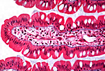 肠绒毛由中央结缔组织轴心和表面覆盖的肠上皮构成。绒毛之间可见 利贝昆氏腺(肠腺) 的开口。 |
