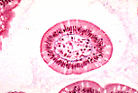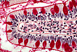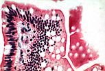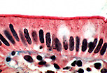 吸收细胞为高柱状细胞,卵圆形细胞核位于基底部,游离面有一粉红色区域即纹状缘,其下方有一条嗜酸性红线。透射电镜显示,纹状缘由微绒毛构成,为吸收细胞提供了巨大的游离面以吸收营养物质;而嗜酸性红线对应终末网——这是一种细胞质区域,微绒毛内的肌动蛋白微丝在此锚定于中间丝。 |