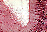 闭锁带在上皮细胞游离端表现为深染的细胞间连接区。它们对应于封闭细胞间隙的连接复合体。上皮游离端的切线切面可显示这些闭锁带形成的网络结构。