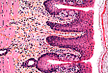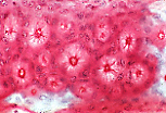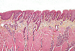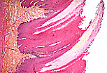 兔的丝状乳头极细,结缔组织轴在组织切片中常难以辨认, 角化的上皮细胞形成完整的角壳,其表面末端膨隆。 |