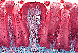 光镜(M.O.)下无法区分的四种细胞构成味蕾,位于上皮内,有神经纤维终止于味蕾; 味蕾通过味孔与口腔相通。 |
