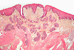 这些角化突起之间有大量退化中的泡状细胞,内含透明角质颗粒(木乃伊化细胞)。 |