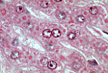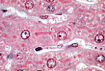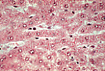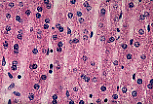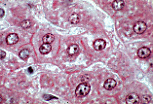 肝细胞常可见双核,或细胞核体积大于平均水平(多倍体细胞)。 正常成年肝脏中核分裂象极少见,因为正常情况下肝细胞的更新速度极慢。 | |