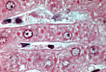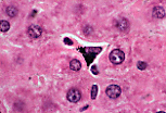 胆小管总是位于肝细胞之间,呈管状或线状。 |