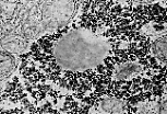透射电镜(MET)下,糖原表现为电子致密颗粒,呈玫瑰花结状聚集;也可识别出脂质包涵体。 | |