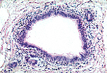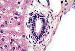 赫林管汇合成管径更大的胆管,胆管衬覆单层柱状上皮, 上皮外有少量同心圆排列的结缔组织支持。 | |