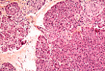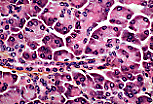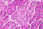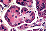 浆液性腺泡细胞可通过酶原颗粒和腺泡状排列识别; 胰岛内排列成索状的内分泌细胞细胞质更浅,细胞核居中。 |