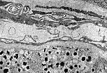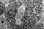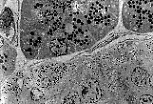 透射电镜(MET)下观察胰腺腺泡,泡心细胞清晰可见; 其淡染的细胞质与充满酶原颗粒的浆液性腺泡细胞形成鲜明对比。 |