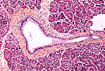 粗大的小叶间导管管腔宽大,衬覆单层柱状上皮; 这些导管走行于结缔组织隔内,最终汇入主胰管(Wirsung管)。 |