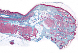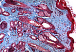 临近肛缘的皮肤区具有典型的皮肤覆盖特征, 即B型角化上皮,伴有无 典型皮肤覆盖结构 ,也就是B型角化上皮,同时可见 单根毛囊 、皮脂腺以及 顶泌汗腺 。 |