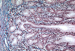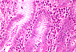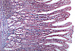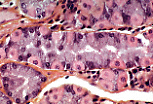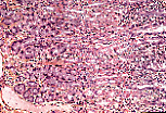 颈段上皮是细胞更新的部位,既补充胃小凹和表面上皮的细胞,也补充胃腺的细胞,因此此处可见活跃的有丝分裂。 |