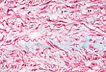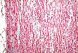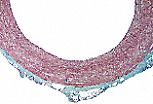 该视野显示中膜的细节:可见大量堆叠的同心环状弹性膜(嗜酸性无细胞的条纹)。