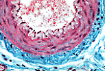 地衣红染色可显示动脉管壁中富含弹性纤维的区域,即内弹性膜和外膜。
