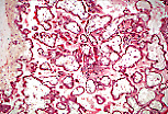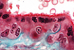 该视野可见绒毛间隙(血腔)内的母体红细胞,这些红细胞直接与滋养层细胞(包绕胎儿毛细血管的胎盘绒毛表面)接触。这种结构有利于母-胎间的物质交换。