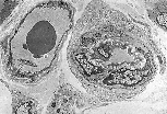 小口径微动脉与微静脉的区别:微静脉管腔更呈椭圆形,且无内弹性膜和中膜结构。 |