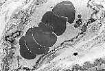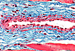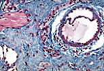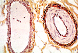 地衣红染色显示,微静脉管壁内的弹性纤维数量少且结构松散(静脉管壁亦是如此),与动脉形成鲜明对比。 |