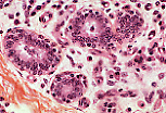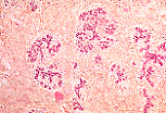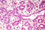 小叶内导管和腺泡的管壁由两层细胞构成:内层为柱状上皮细胞,外层为肌上皮细胞(因富含糖原,在月经周期不同阶段有时呈明显淡染)。 |