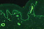 基膜中含有层粘连蛋白等蛋白质,该皮肤标本通过偶联荧光素异硫氰酸酯(FITC)的抗层粘连蛋白抗体检测到了层粘连蛋白。 |
