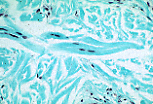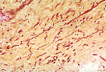 经地衣红染色显示,网状层的胶原纤维束之间分布着大量弹性纤维。 |