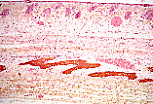 在这段正在形成的骨小梁上,可见上皮样成骨细胞合成类骨质,同时也可见一些已被包埋在矿化骨陷窝(骨陷窝)内的骨细胞。 |