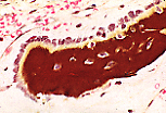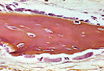 Von Kossa染色将骨小梁的矿化部分染为棕色,而成骨细胞最新沉积的一层(类骨质带或成骨区)则被染为黄色。 |