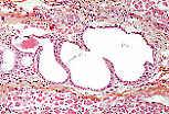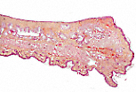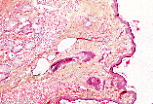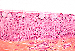 覆盖眼睑内侧面的睑结膜由复层柱状上皮构成,含有杯状细胞,其下为富含淋巴成分和毛细血管的固有层。 |
